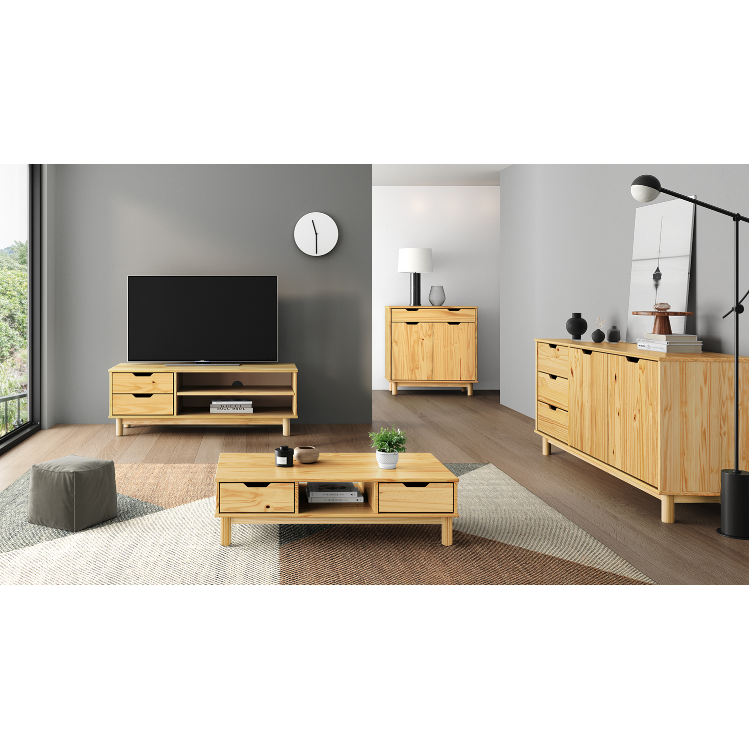 materiál masiv borovice, lakované provedení 2 zásuvky s kovovými pojezdy, 1 dvířka, 1 police otvor na protažení kabelů