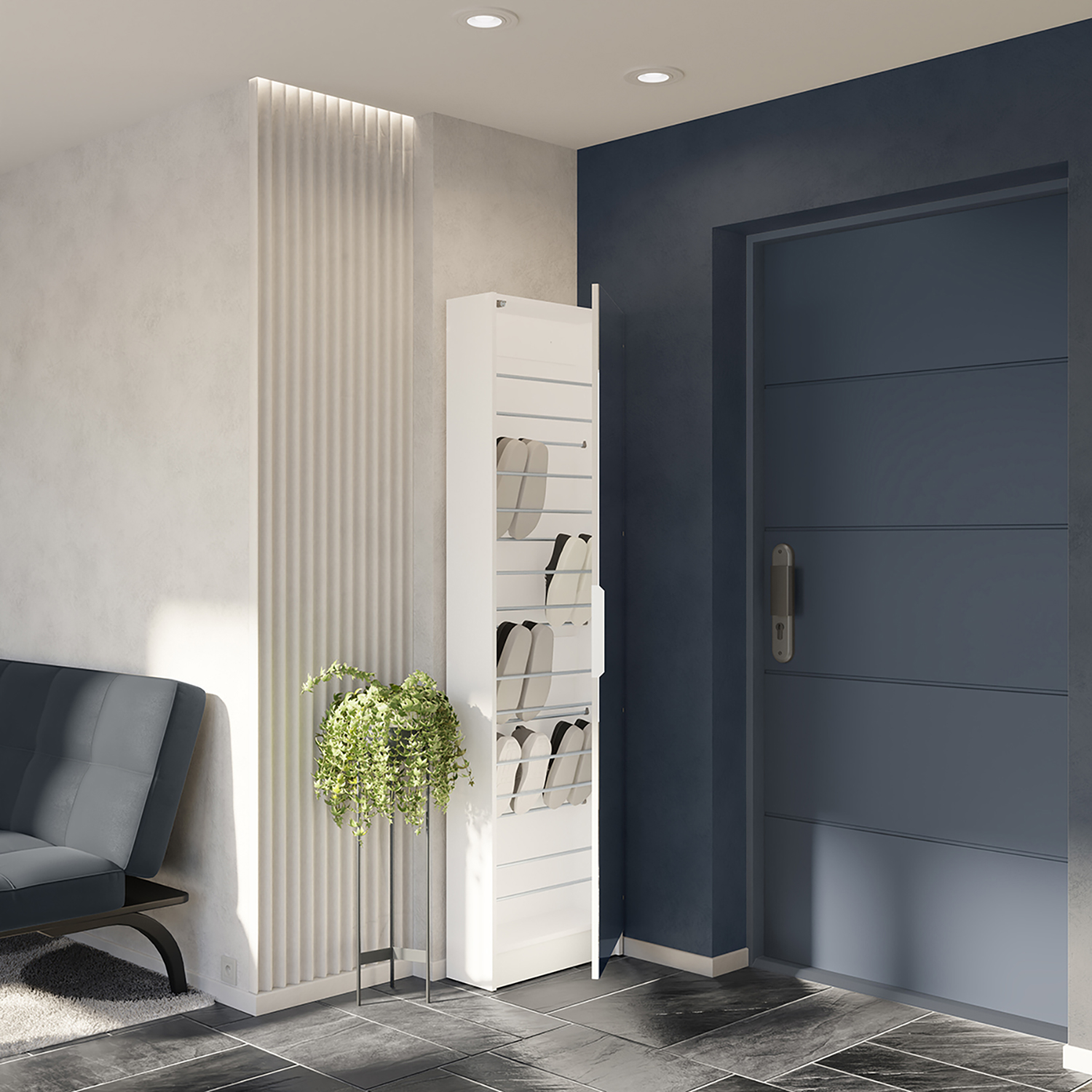 barevné provedení matná bílá na dveřích zrcadlo 50 × 173 cm, kovová úchytka montáž možná na levou i pravou stranu 6 úrovní pro 12 párů bot