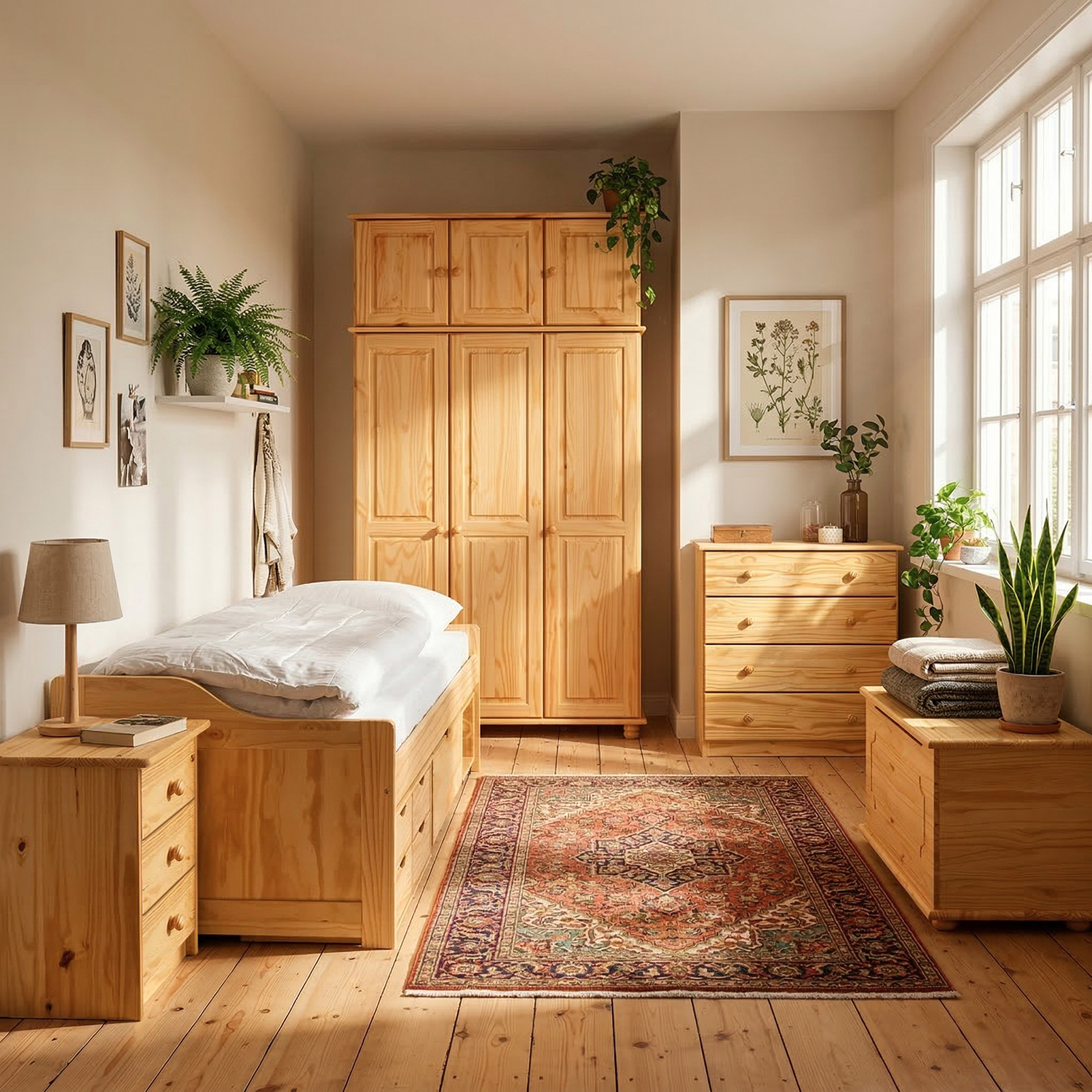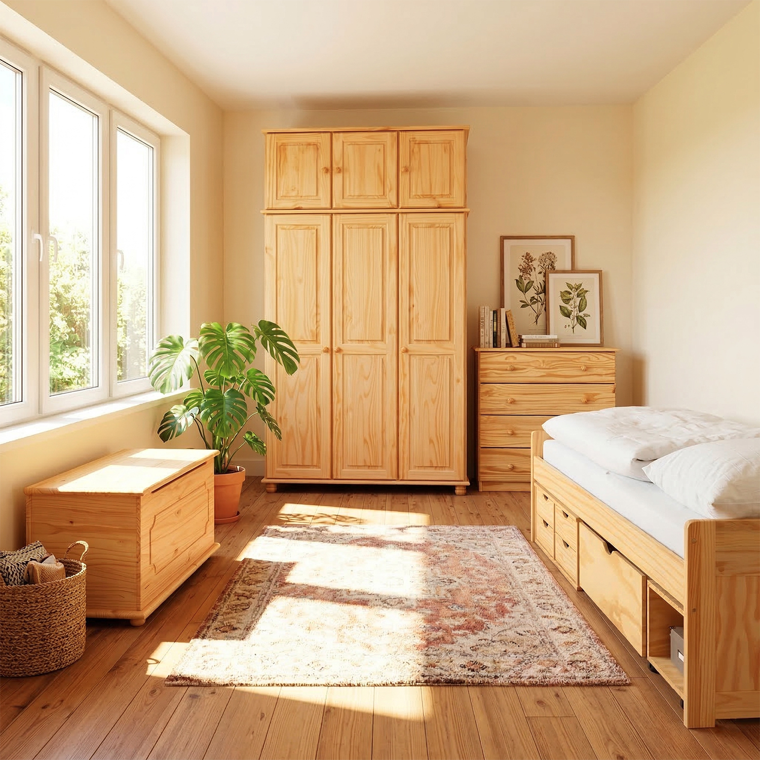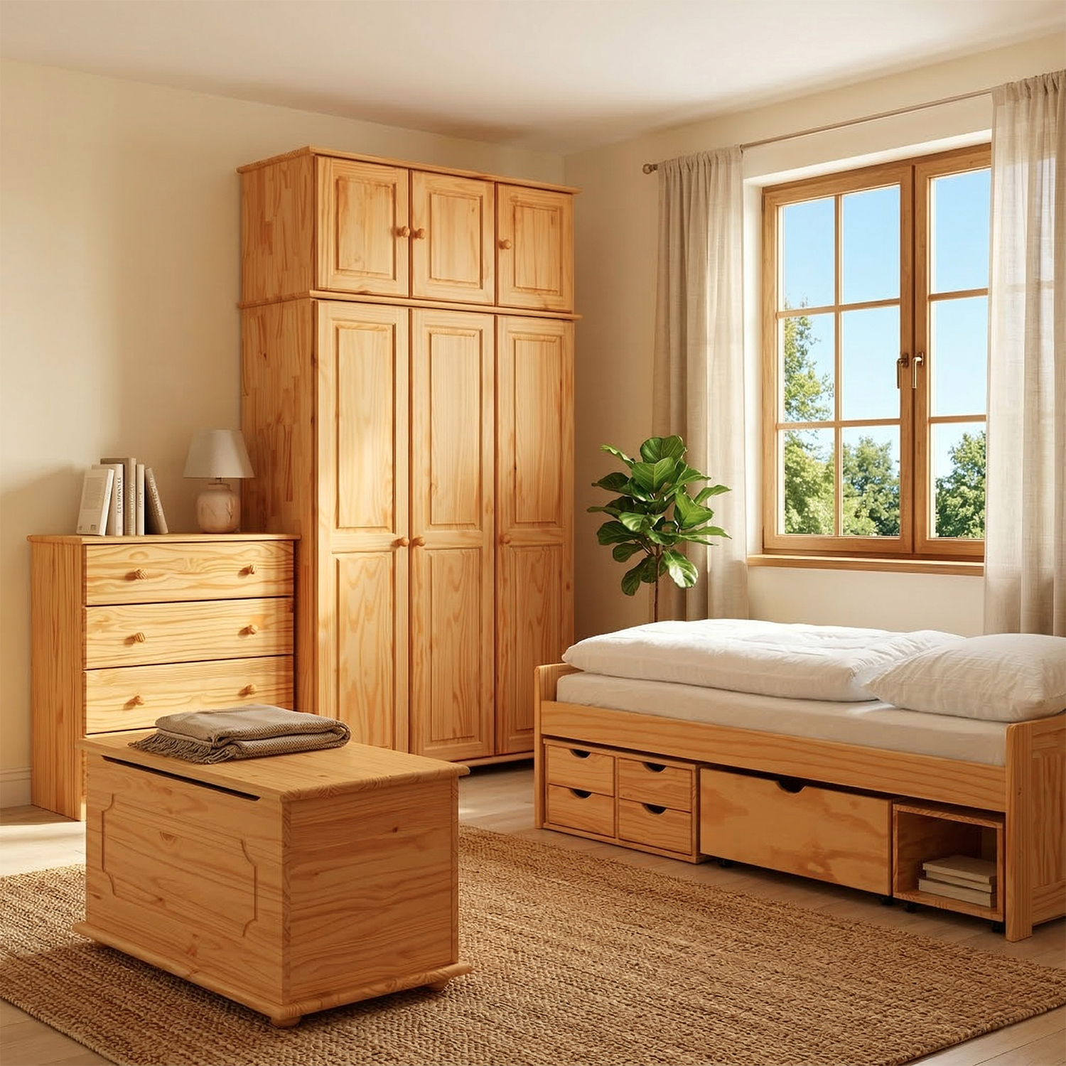 materiál masiv borovice, lakované provedení jedny dvířka, jedna variabilní police 4 široké zásuvky s kovovými pojezdy, hloubka zásuvky 33,5 cm