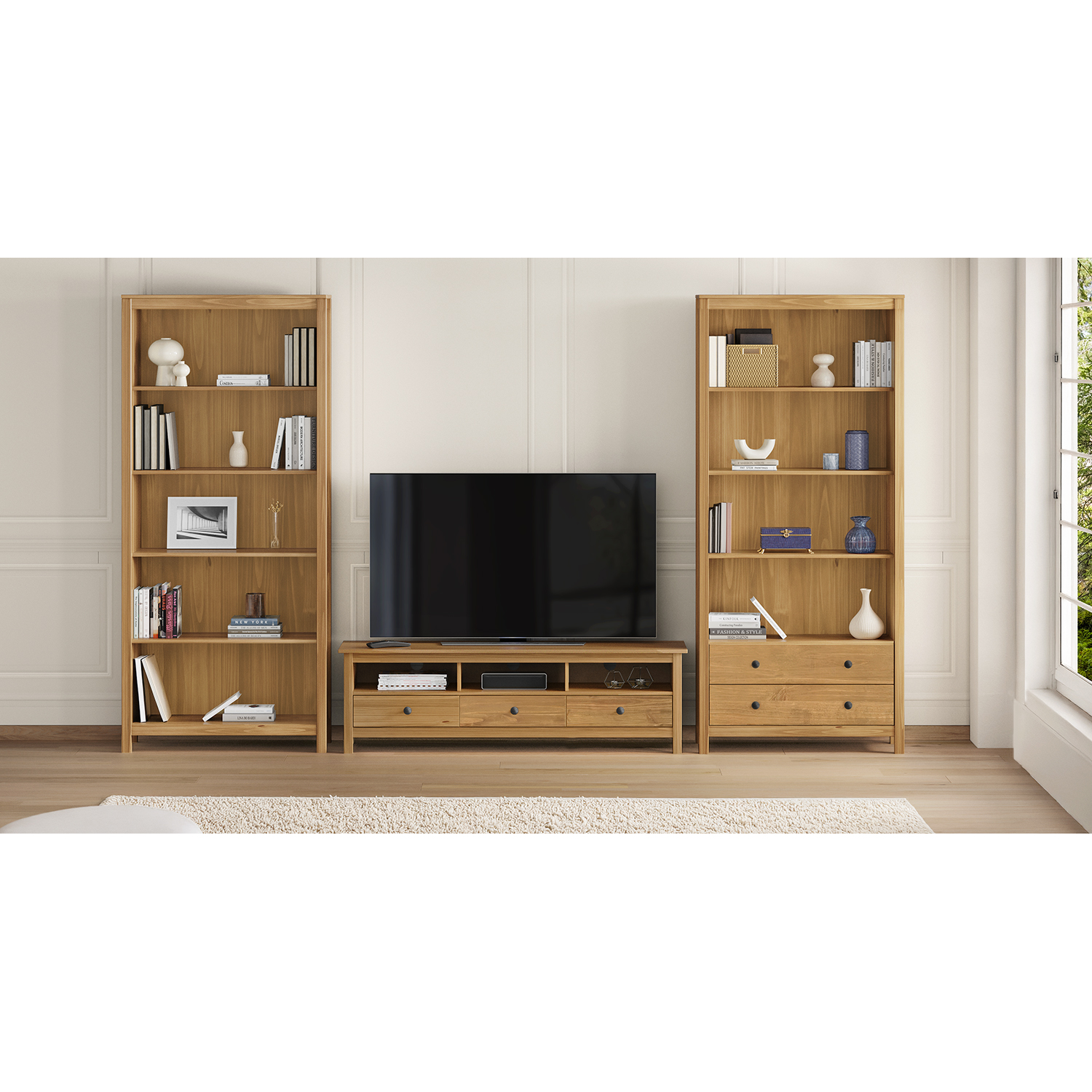 sestava knihoven TORINO 8070V a 8071V a vitríny TORINO 8072V materiál masiv borovice voskovaná v medovém odstínu kovové úchytky v barevném p...