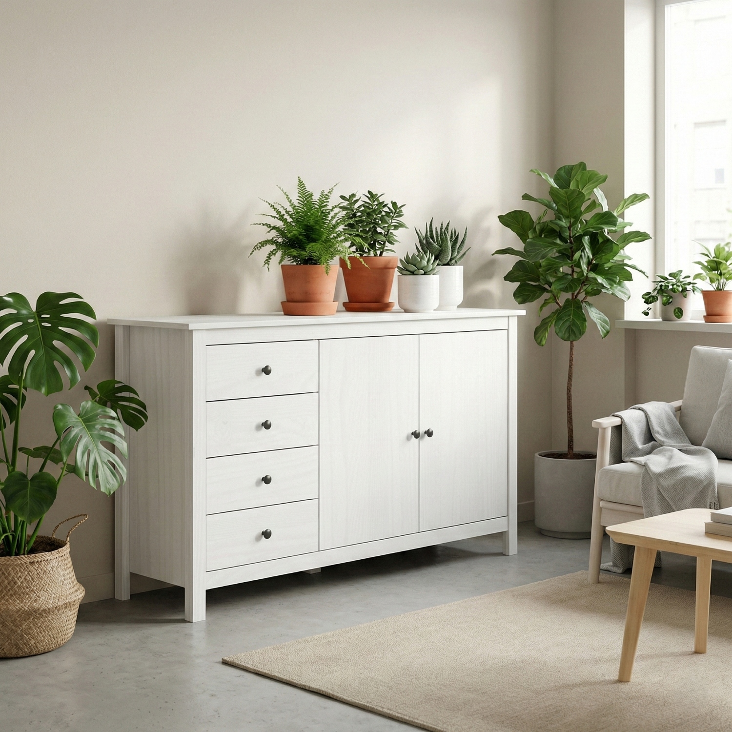 materiál masiv borovice, barevné provedení bílý lak kovové úchytky v barevném provedení černěná mosaz čtyři zásuvky s kovovými pojezdy