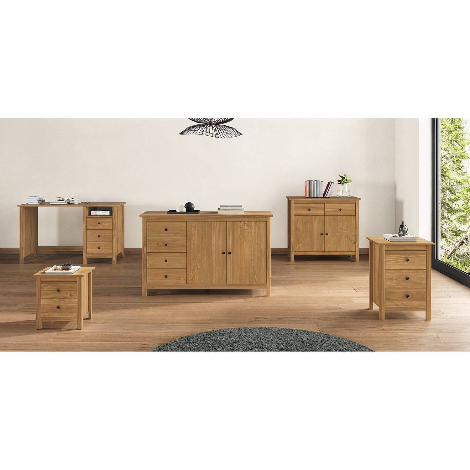 materiál masiv borovice voskovaná v medovém odstínu kovové úchytky v barevném provedení černěná mosaz 2 otevřené police, 1 dvířka a 3 zásuvk...