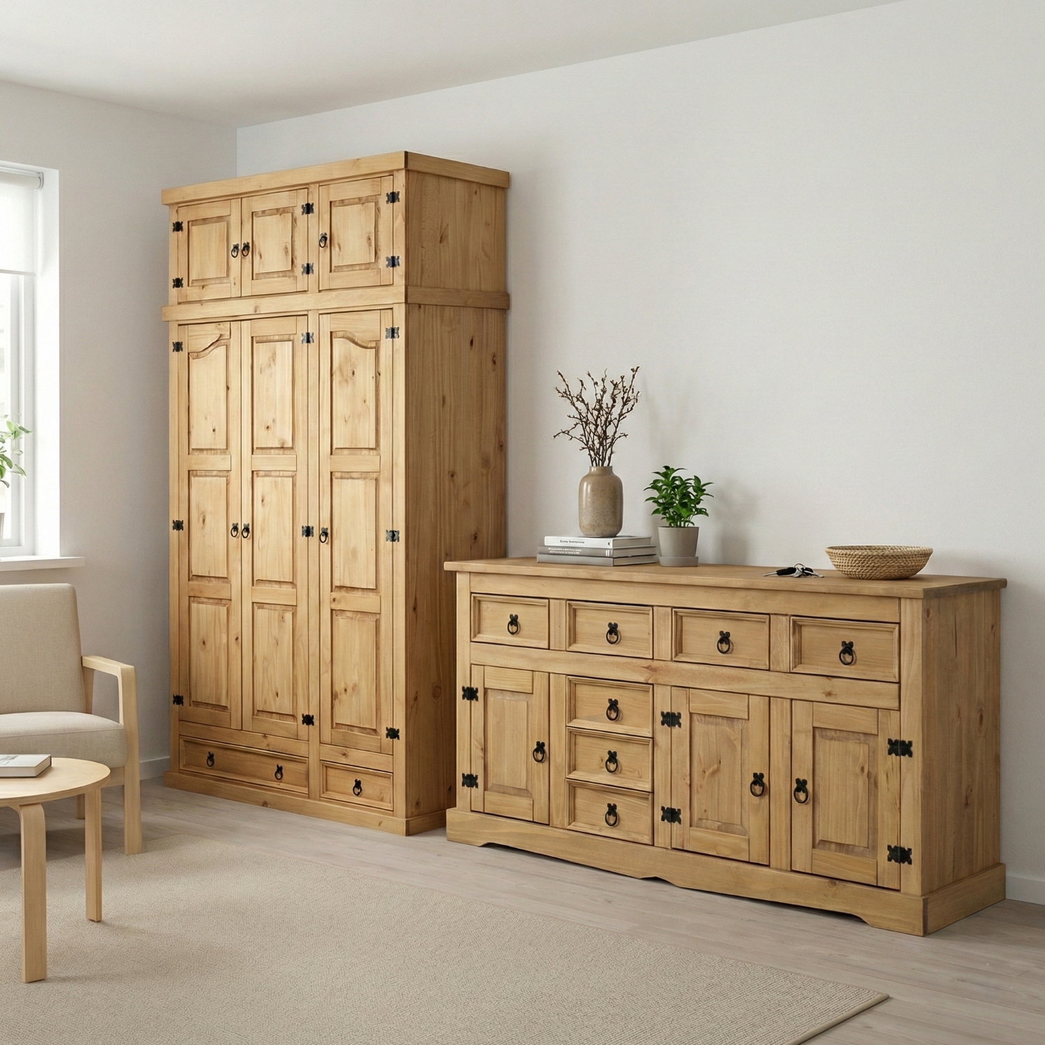 materiál masiv borovice voskovaná v medovém odstínu kovové ozdobné úchytky a petlice součást sestavy Corona
