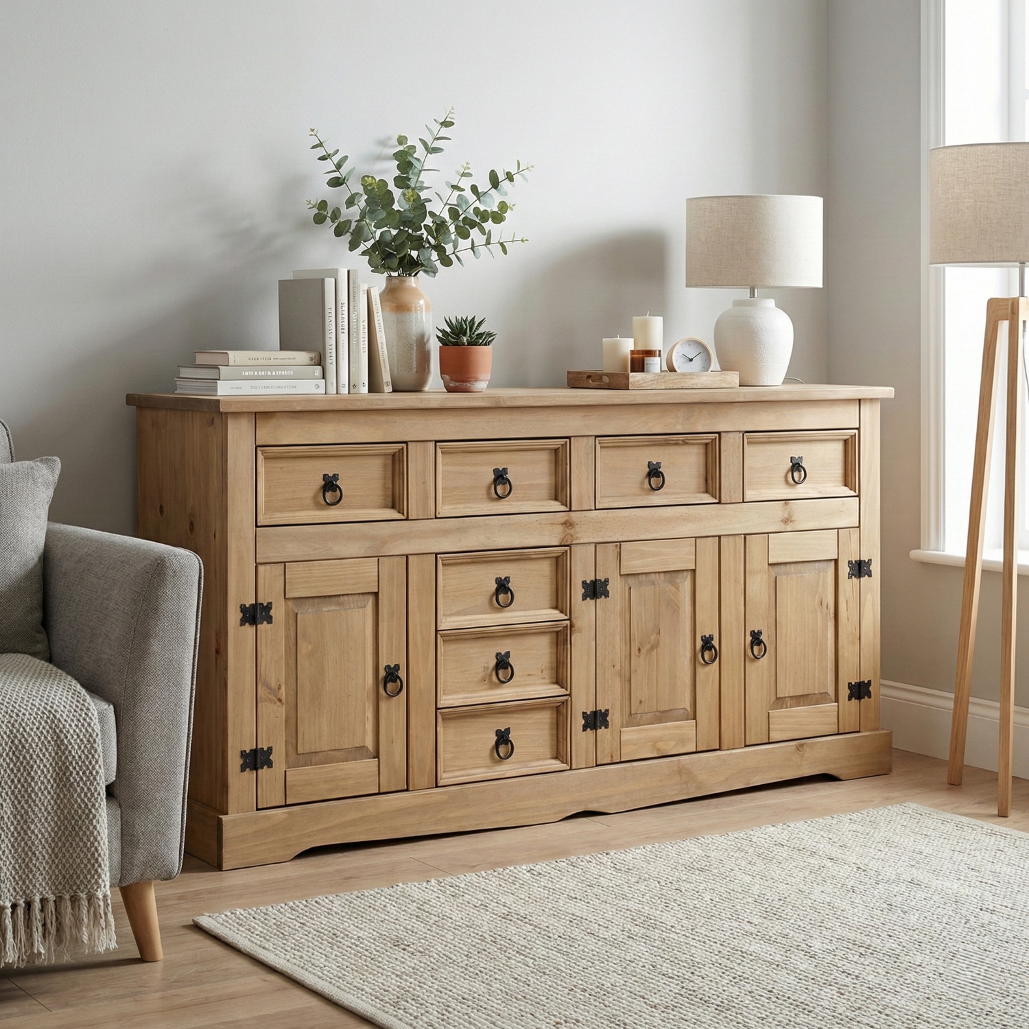 materiál masiv borovice voskovaná v medovém odstínu 4 velké zásuvky, kovové ozdobné úchytky součást sestavy Corona