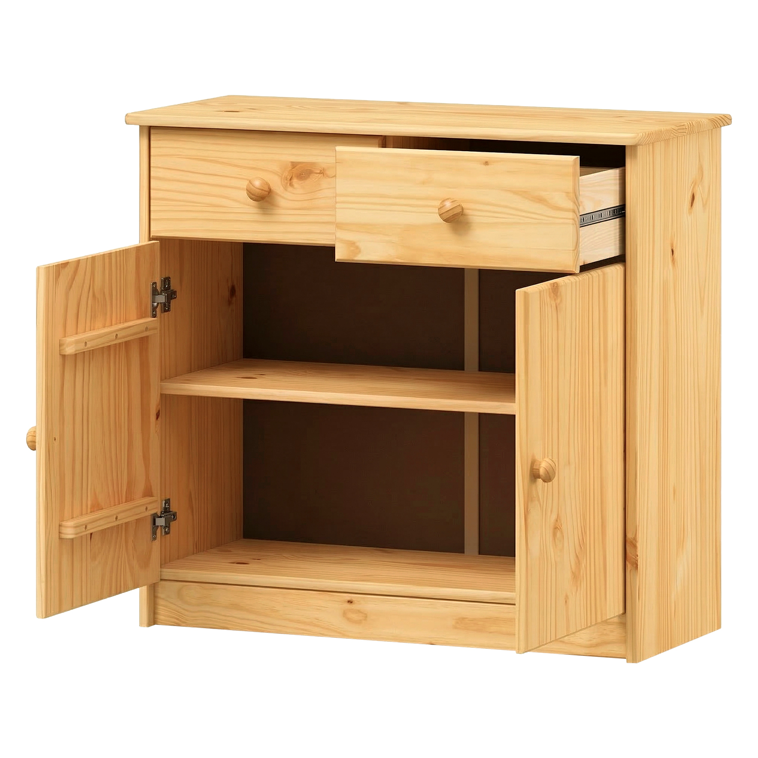 materiál masiv borovice, lakované provedení skřínka s dvířky a jednou variabilní policí, široká zásuvka hloubka zásuvky 36,5 cm