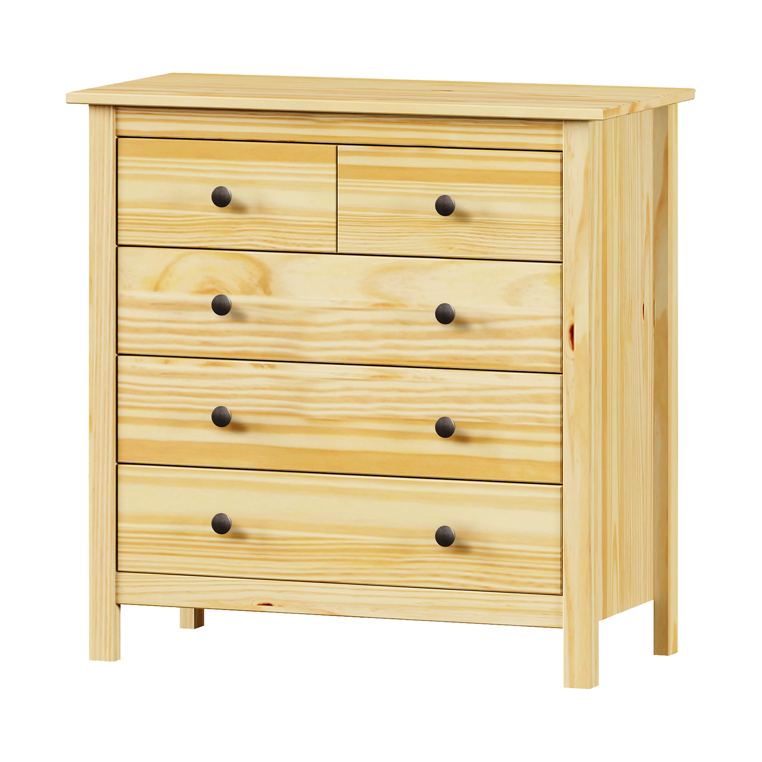 materiál masiv borovice, lakované provedení kovové úchytky v barevném provedení černěná mosaz 5 zásuvek s kovovými pojezdy