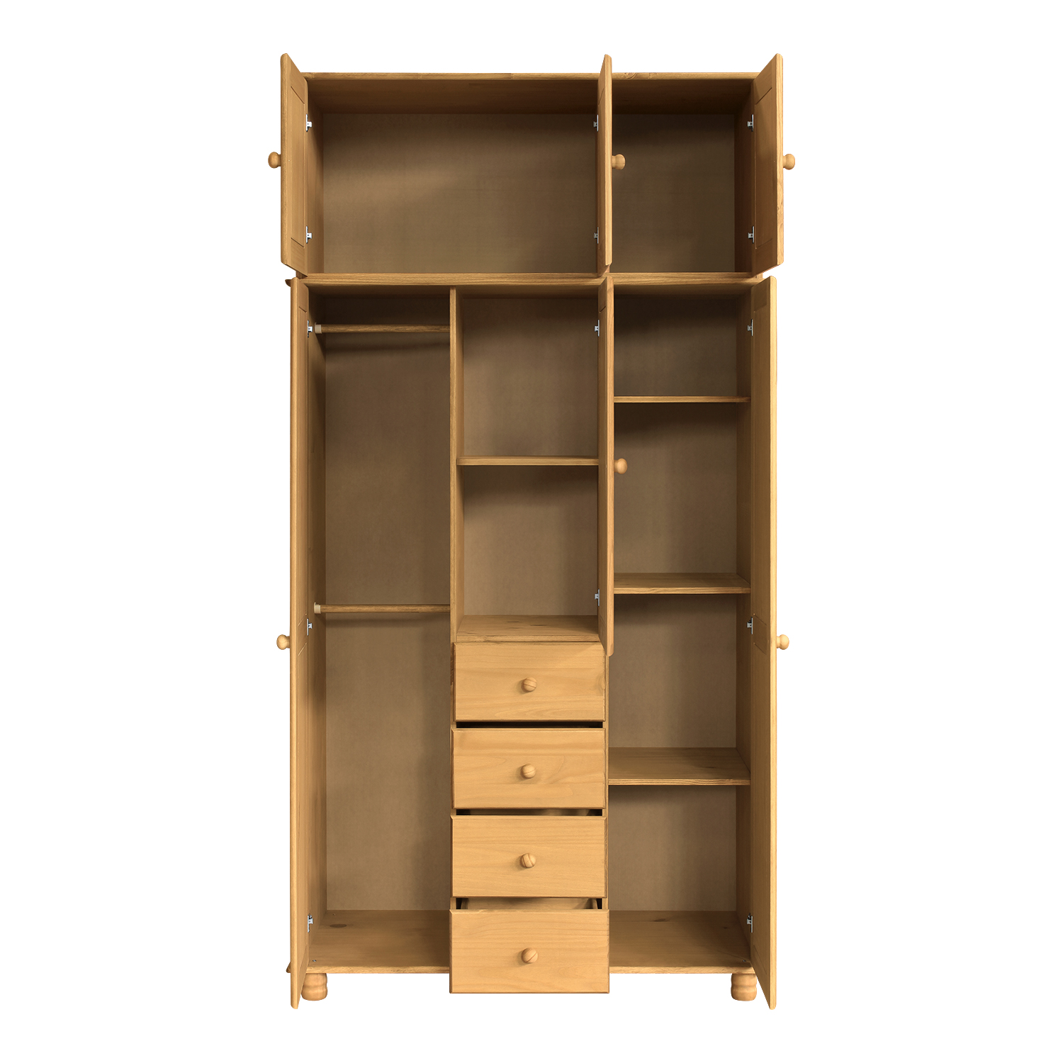 materiál masiv borovice, voskované provedení čtyři zásuvky s kovovými pojezdy v levé části dvě šatní tyče, ve střední části 1 police a v pra...
