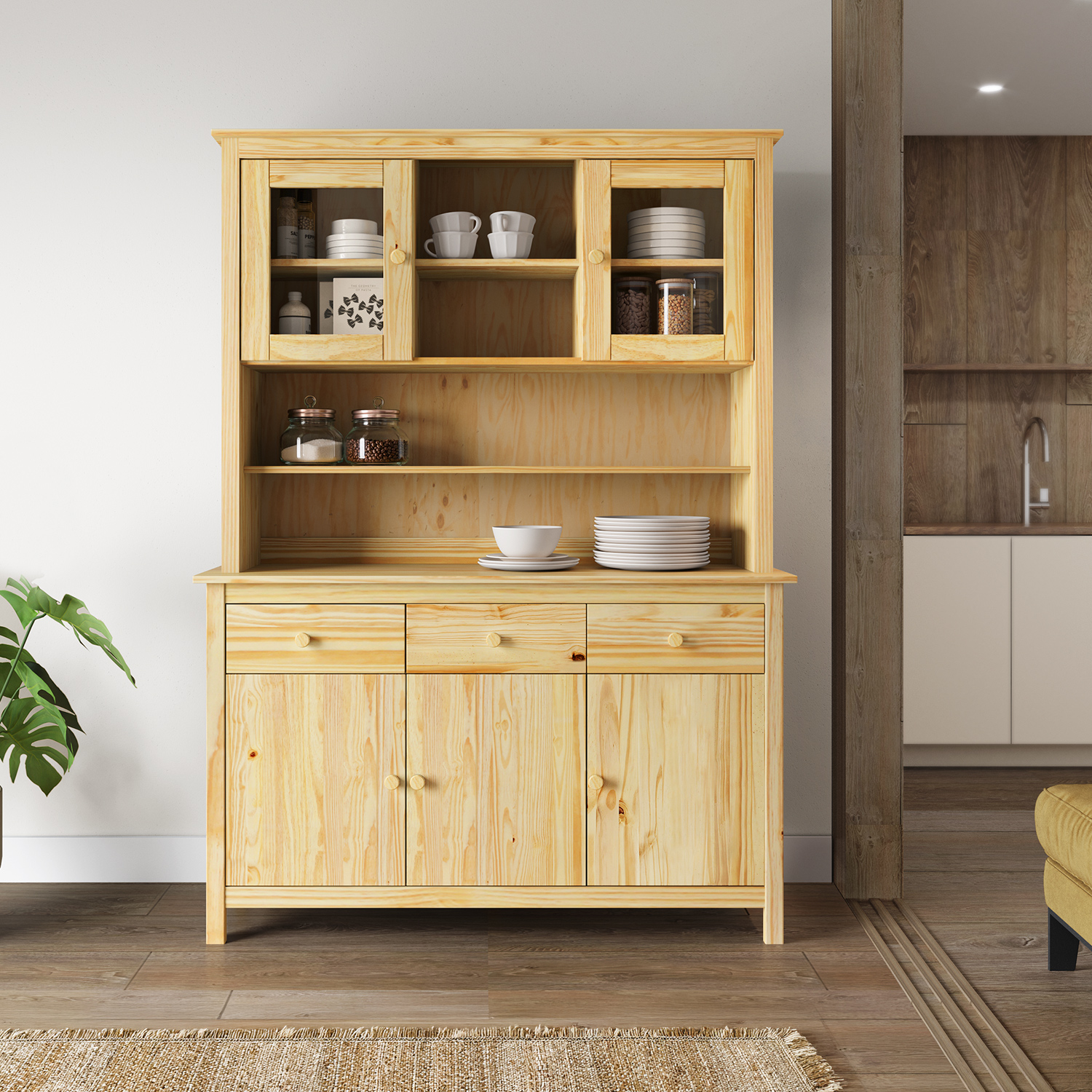 sestava příborníku TORINO 8062 a nástavce TORINO 8063 materiál masiv borovice, lakované provedení příborník: 3 dveře, 3 zásuvky s kovovými p...