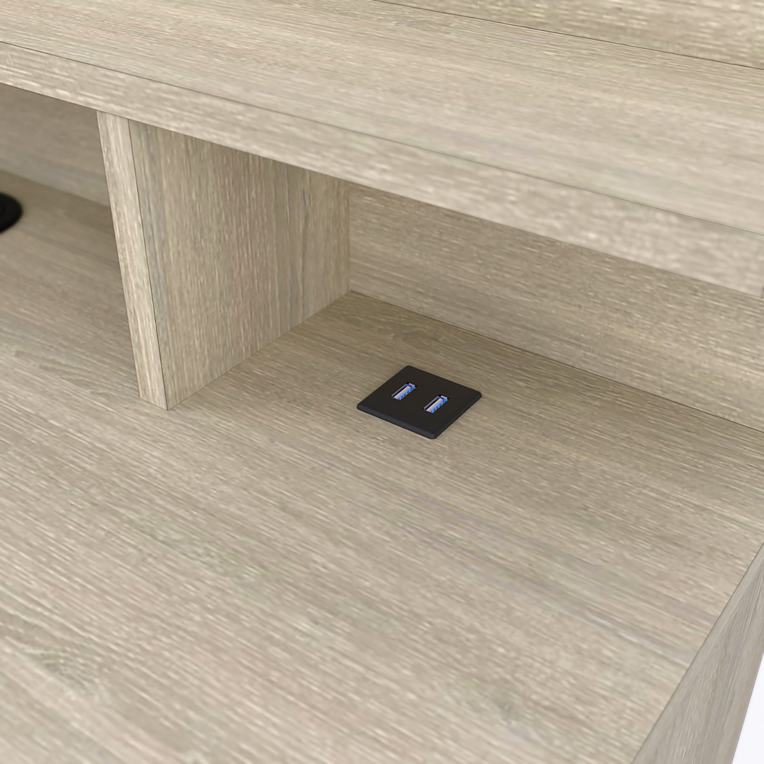 v pracovní desce průchodka na kabely a zásuvka se dvěma USB porty pro nabíjení mobilů, tabletů, hodinek a podobně, s napětím 5 V DC, pro současné nabíjení 2 zařízení 1 A nebo 1 zařízení 2 A