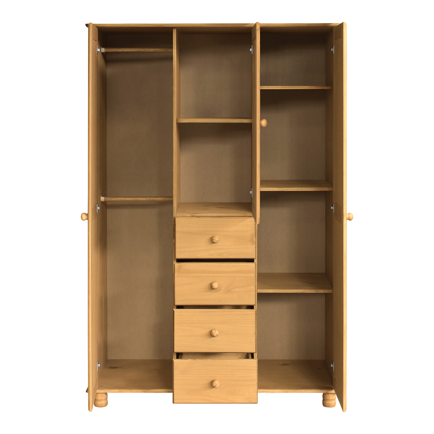materiál masiv borovice, voskované provedení čtyři zásuvky s kovovými pojezdy v levé části dvě šatní tyče, ve střední části 1 police a v pravé části 3 police doporučený nástavec 8864V