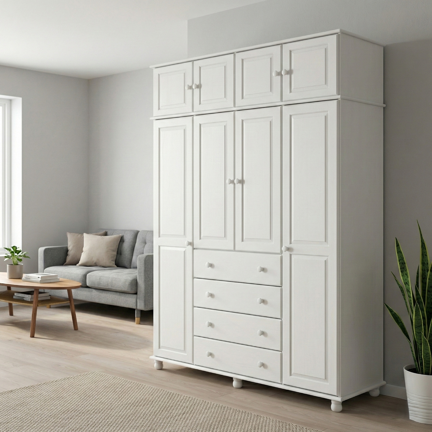 materiál masiv borovice, barevné provedení bílý lak čtyři široké zásuvky s kovovými pojezdy v levé části dvě šatní tyče, ve střední části 1 police a v pravé části 3 police doporučený nástavec 8853B