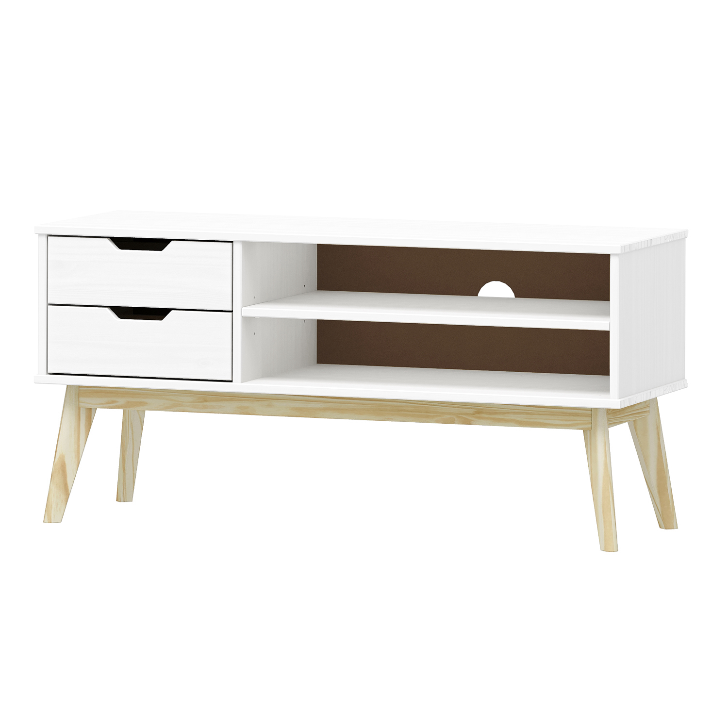 materiál masiv borovice, barevné provedení bílý lak 2 zásuvky s kovovými pojezdy, 1 dvířka, 1 police otvor na protažení kabelů